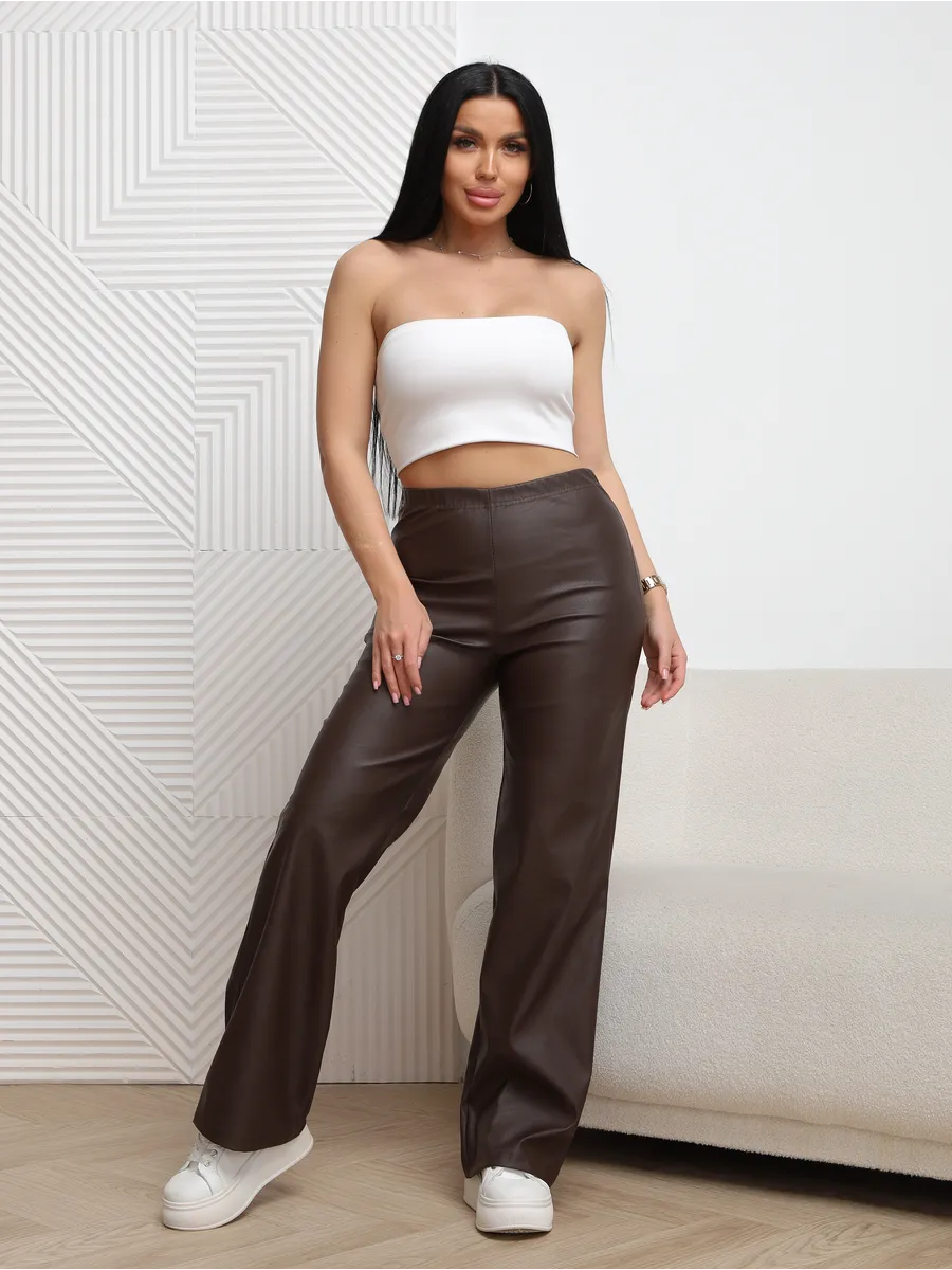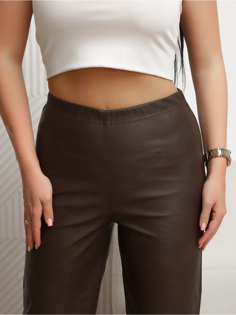 Классические линии брюк подчеркивают силуэт, а натуральный оттенок кожи добавляет изделию изысканности. Эти офисные штаны станут отличным выбором для тех, кто ценит комфорт и стиль в повседневной жизни. Благодаря эко коже, изделие отличается высокой износостойкостью и легкостью ухода. Легкий клеш делает брюки удобными и свободными в движении, что особенно актуально в теплое время года.