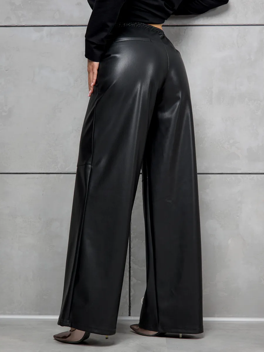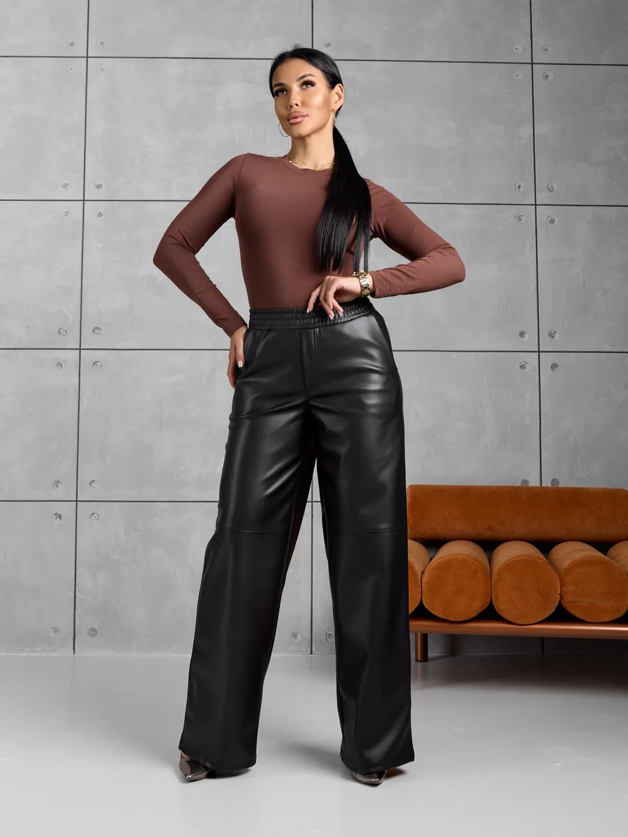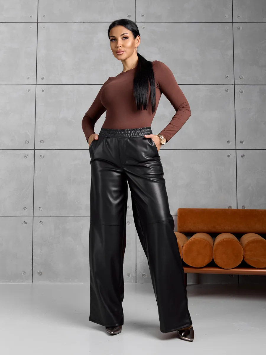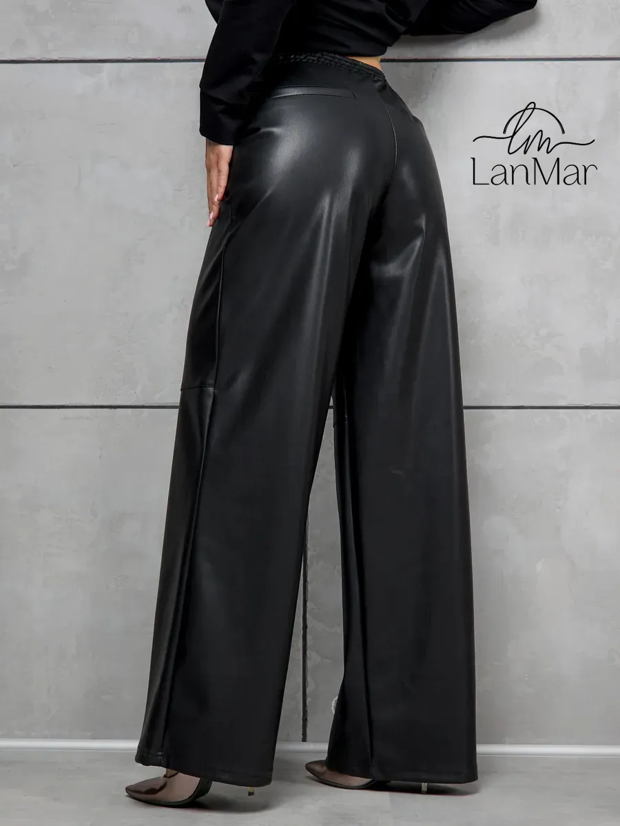 Женские кожаные утепленные брюки — идеальный выбор для прохладного времени года. Стильные штаны выполнены из эко кожи с приятной фактурой, что обеспечивает привлекательный внешний вид и комфорт в носке. Модель на удобной резинке легко садится по фигуре и подходит для разных типов силуэта. Высокой посадкой подчеркивает талию, создавая современный силуэт. Прямые широкие брюки, также известные как палаццо, смотрятся элегантно и визуально удлиняют ноги. Утепленный материал сохраняет тепло, позволяя чувствовать себя уютно при понижении температуры.