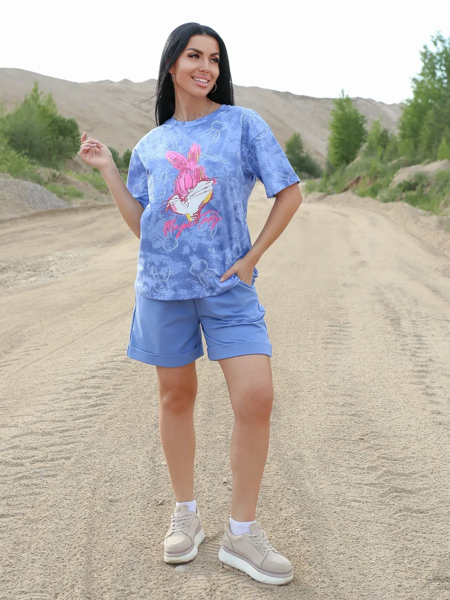 Этот комплект гармонично впишется в гардероб для летнего периода, размерный ряд включает большие размеры. В таком костюме можно отправиться как на прогулку по городу, так и на природу или к морю. Ткань дышит, что особенно важно в жару.