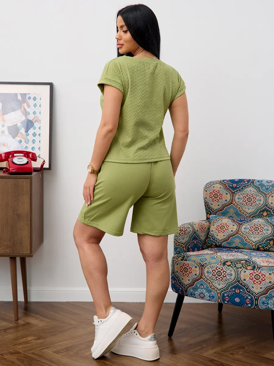 Этот комплект гармонично впишется в гардероб для летнего периода, размерный ряд включает большие размеры. В таком костюме можно отправиться как на прогулку по городу, так и на природу или к морю. Ткань дышит, что особенно важно в жару.