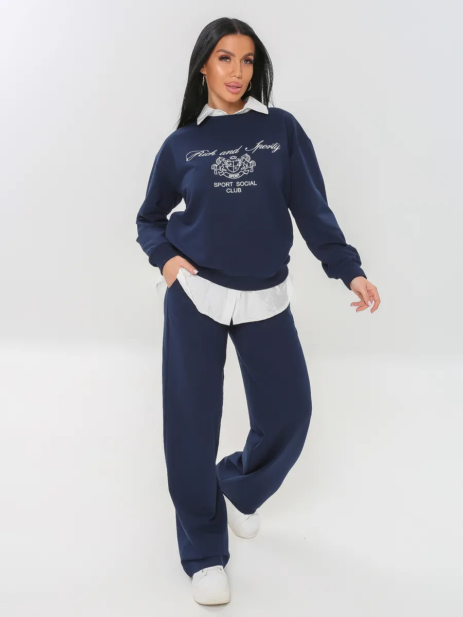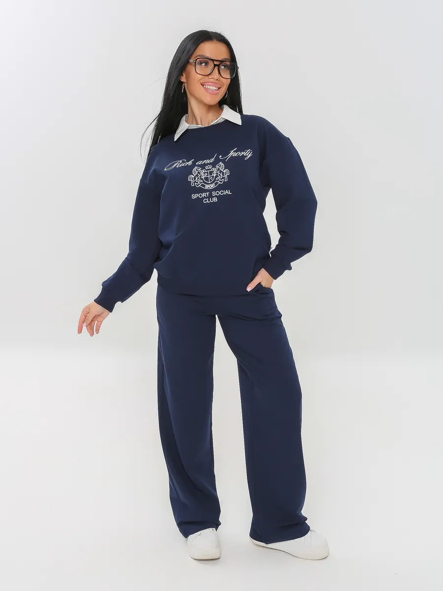 Спортивный костюм женский оверсайз из мягкого материала футер двунитка идеально подойдет для повседневной носки и активного отдыха. Двойка с широкими штанами палаццо и свободным кроем обеспечит комфорт на прогулках, а также станет стильным решением для спорта. Брючный костюм рассчитан на любой тип фигуры, включая большие размеры, что делает его подходящим выбором даже для беременных.