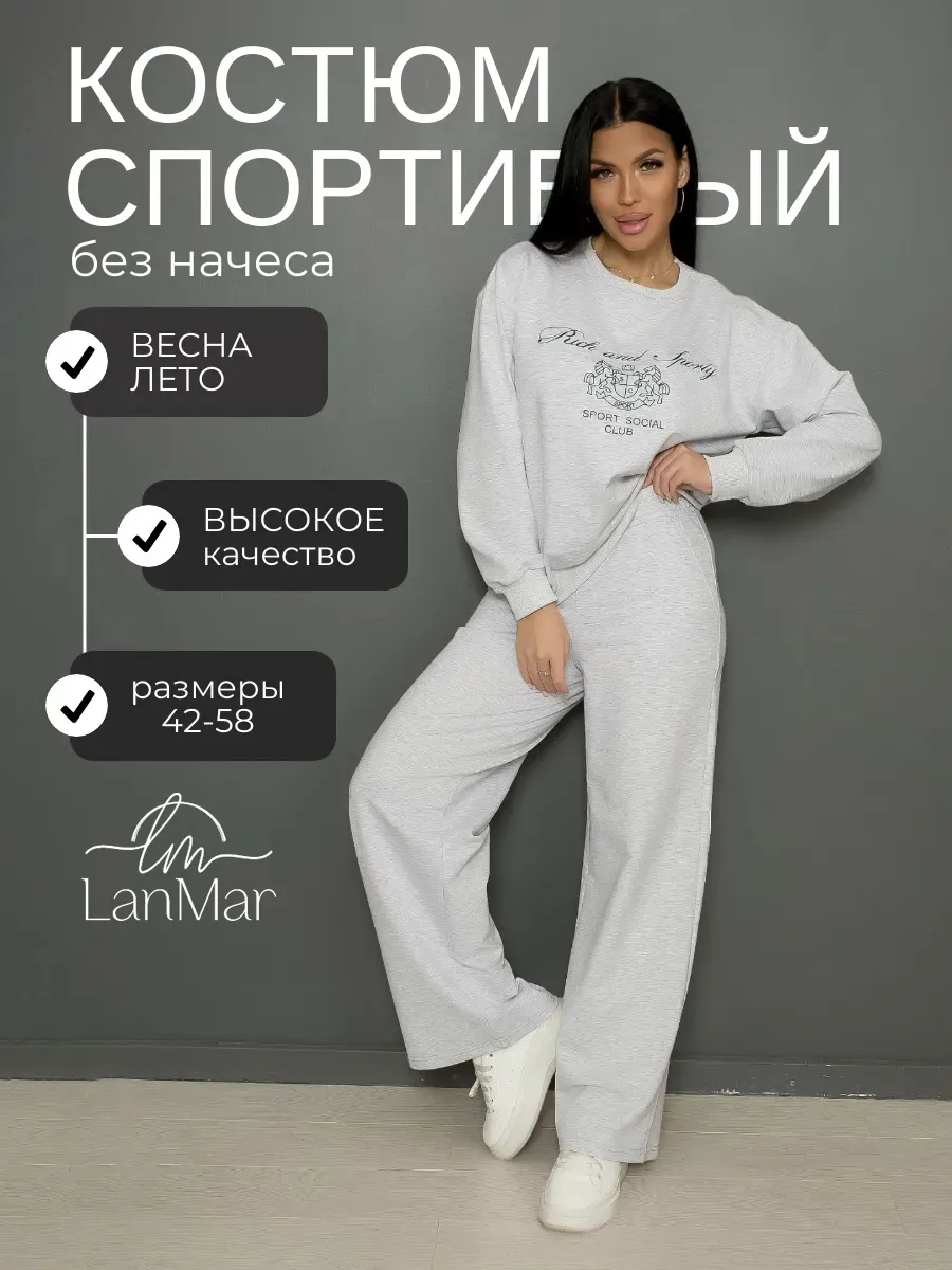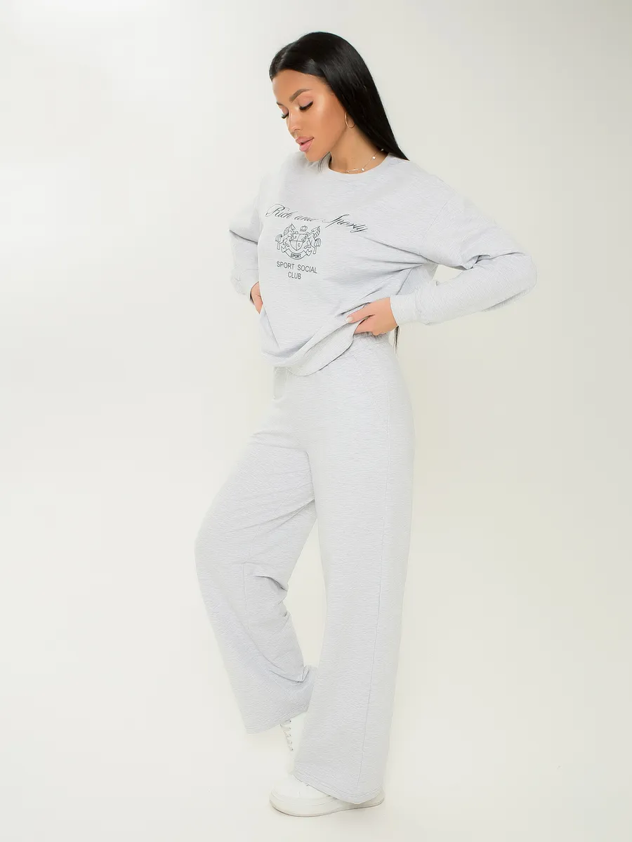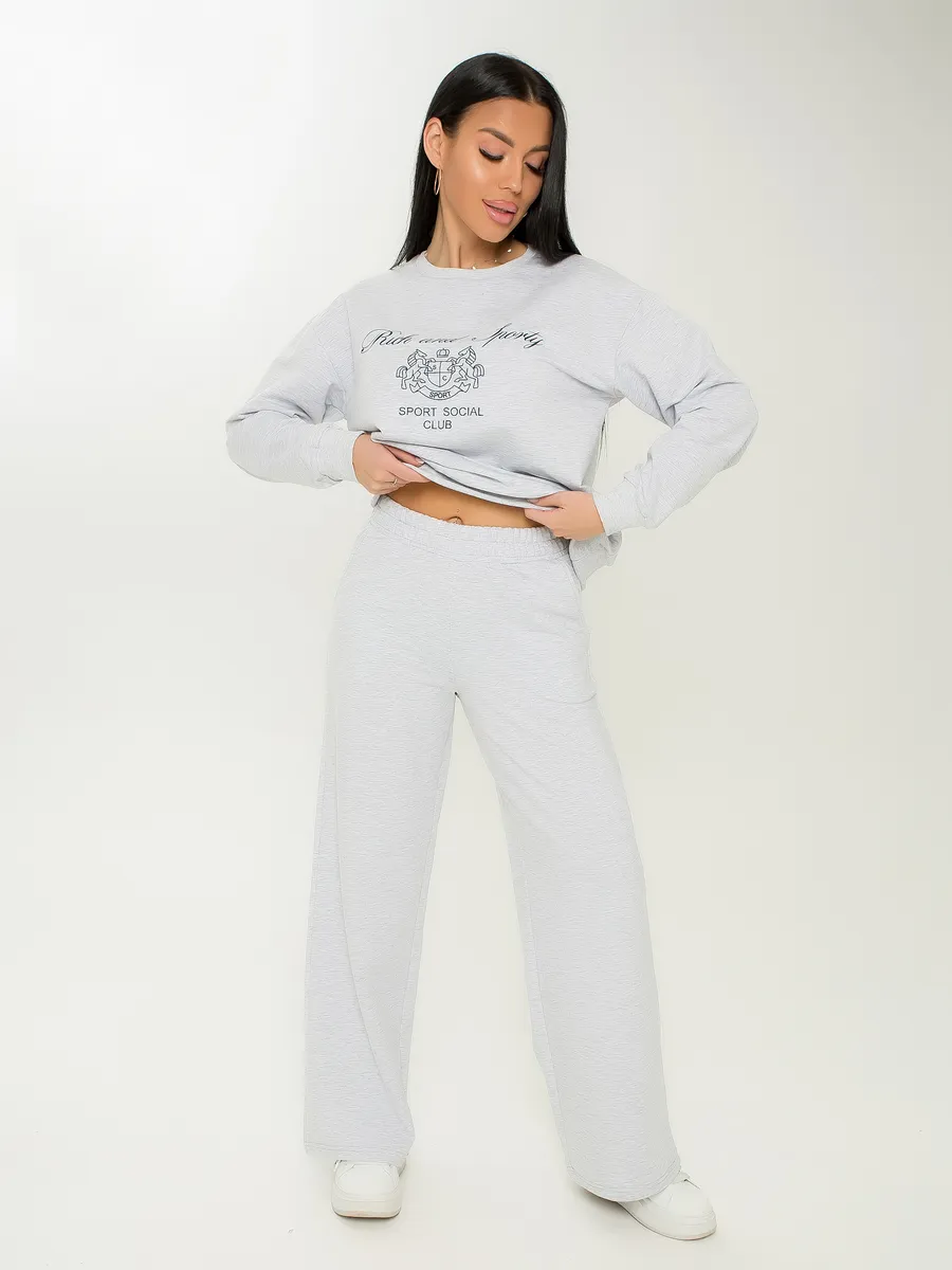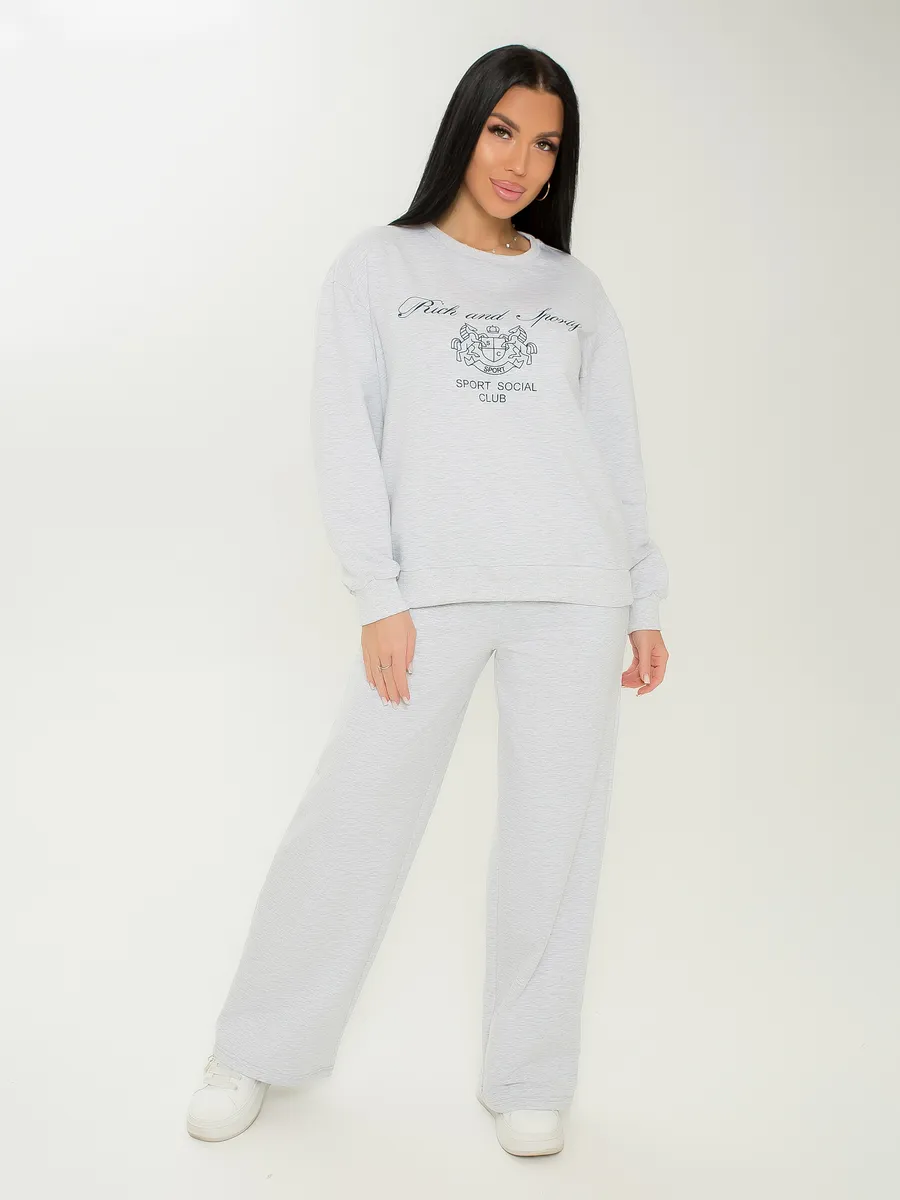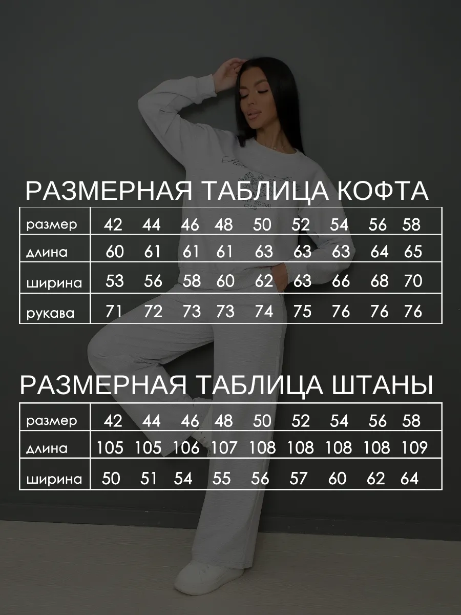 Спортивный костюм женский оверсайз из мягкого материала футер двунитка идеально подойдет для повседневной носки и активного отдыха. Двойка с широкими штанами палаццо и свободным кроем обеспечит комфорт на прогулках, а также станет стильным решением для спорта. Брючный костюм рассчитан на любой тип фигуры, включая большие размеры, что делает его подходящим выбором даже для беременных.