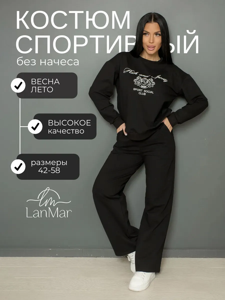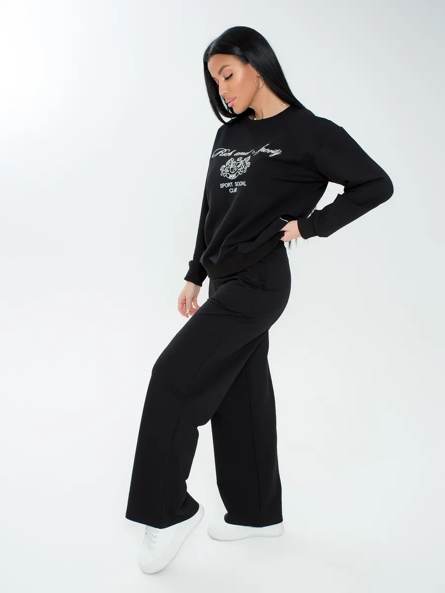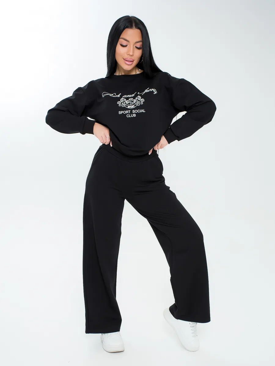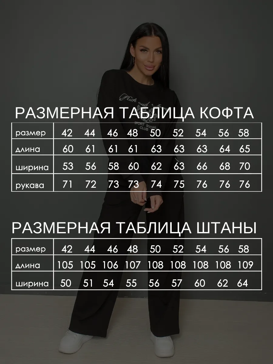 Спортивный костюм женский оверсайз из мягкого материала футер двунитка идеально подойдет для повседневной носки и активного отдыха. Двойка с широкими штанами палаццо и свободным кроем обеспечит комфорт на прогулках, а также станет стильным решением для спорта. Брючный костюм рассчитан на любой тип фигуры, включая большие размеры, что делает его подходящим выбором даже для беременных.