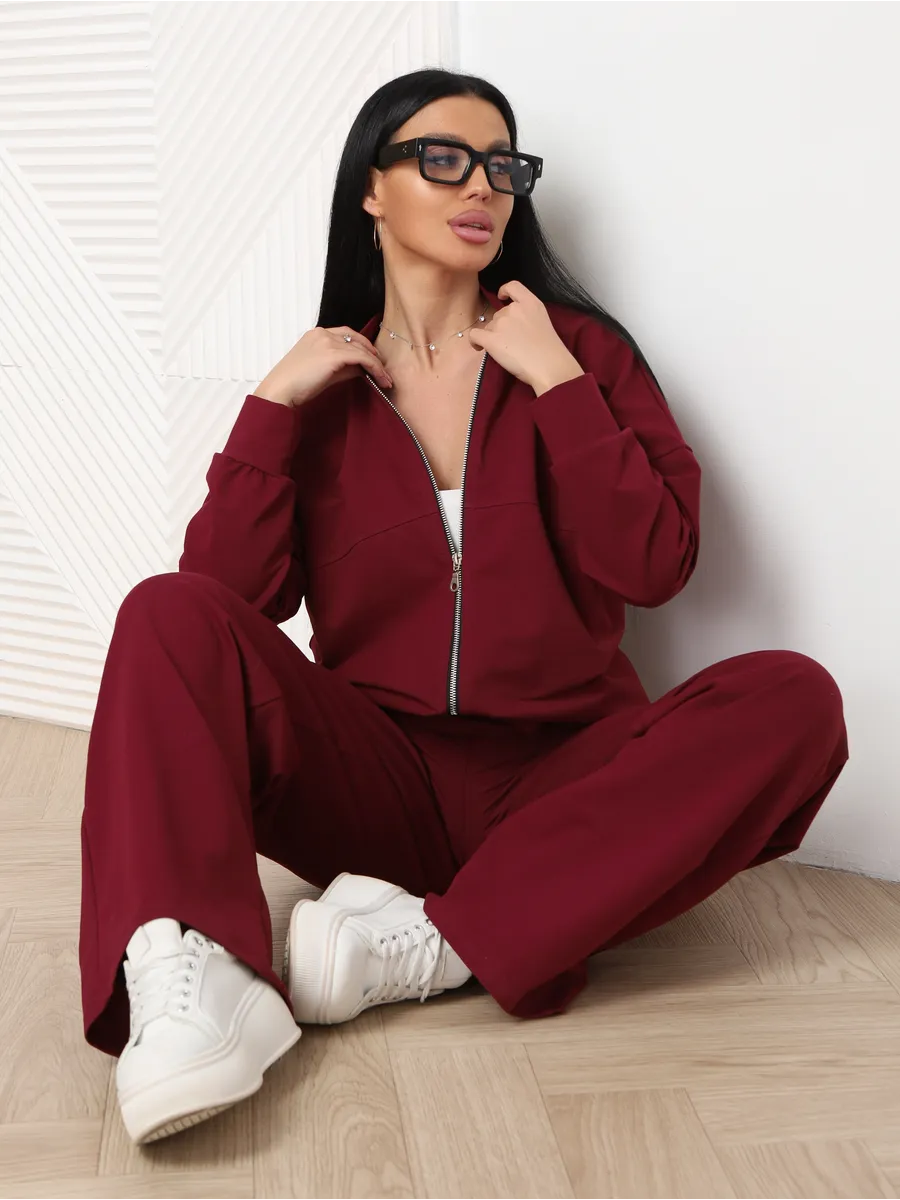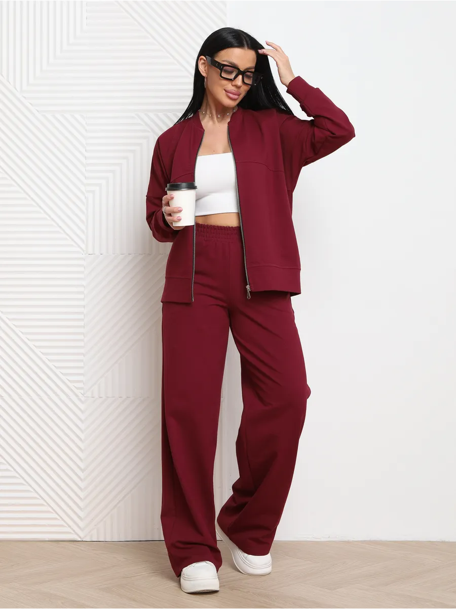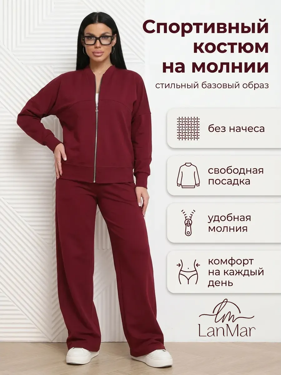 Практичная застежка на молнии обеспечивает удобство при переодевании и регулирует комфорт в зависимости от погоды. Двойка включает бомбер на молнии и широкие штаны, что позволяет носить элементы как вместе, так и отдельно, создавая новые сочетания в гардеробе. Костюм легко впишется в базовый гардероб и подойдет для прогулок, тренировок, отдыха на природе.